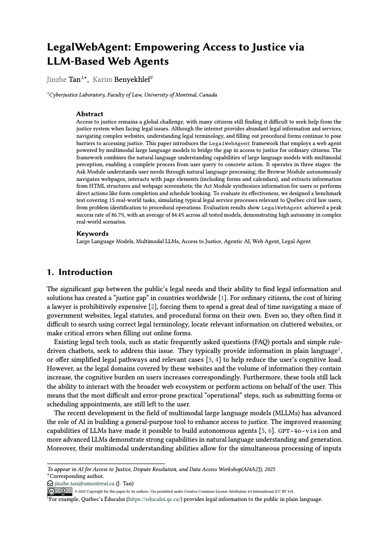 Consultez LegalWebAgent: Empowering Access to Justice via LLM-Based Web Agents (Jinzhe Tan, Karim Benyekhlef) en pré-publication ci-dessous :
