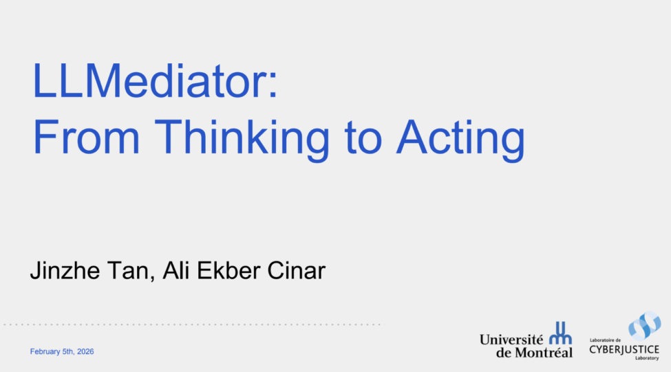 LLMediator est une plateforme de résolution en ligne des différends propulsée par grand modèle de langage (LLM) et développée par le Laboratoire de cyberjustice. Tan a notamment présenté un design et des fonctionnalités améliorées et les a démontrées en direct.